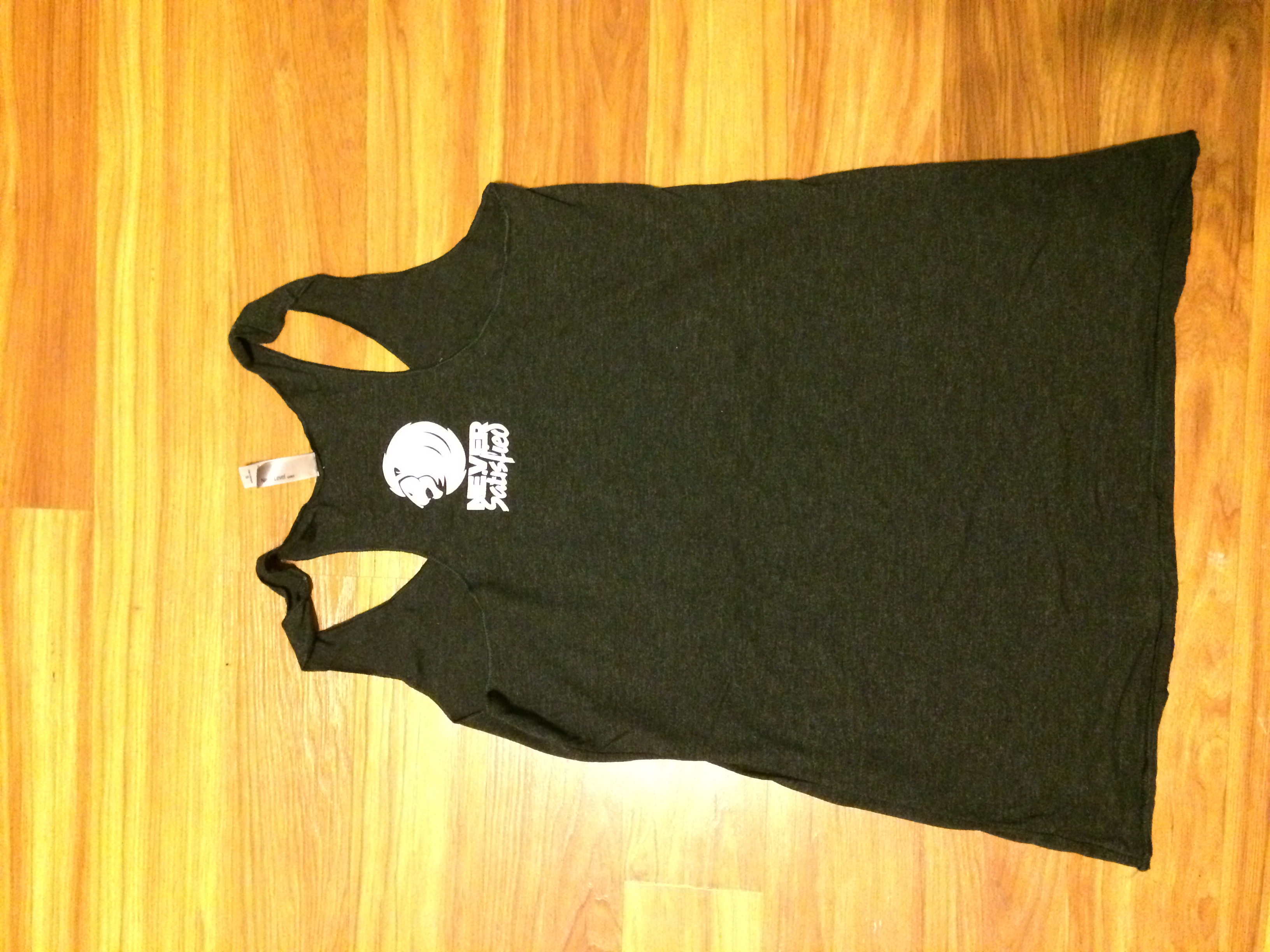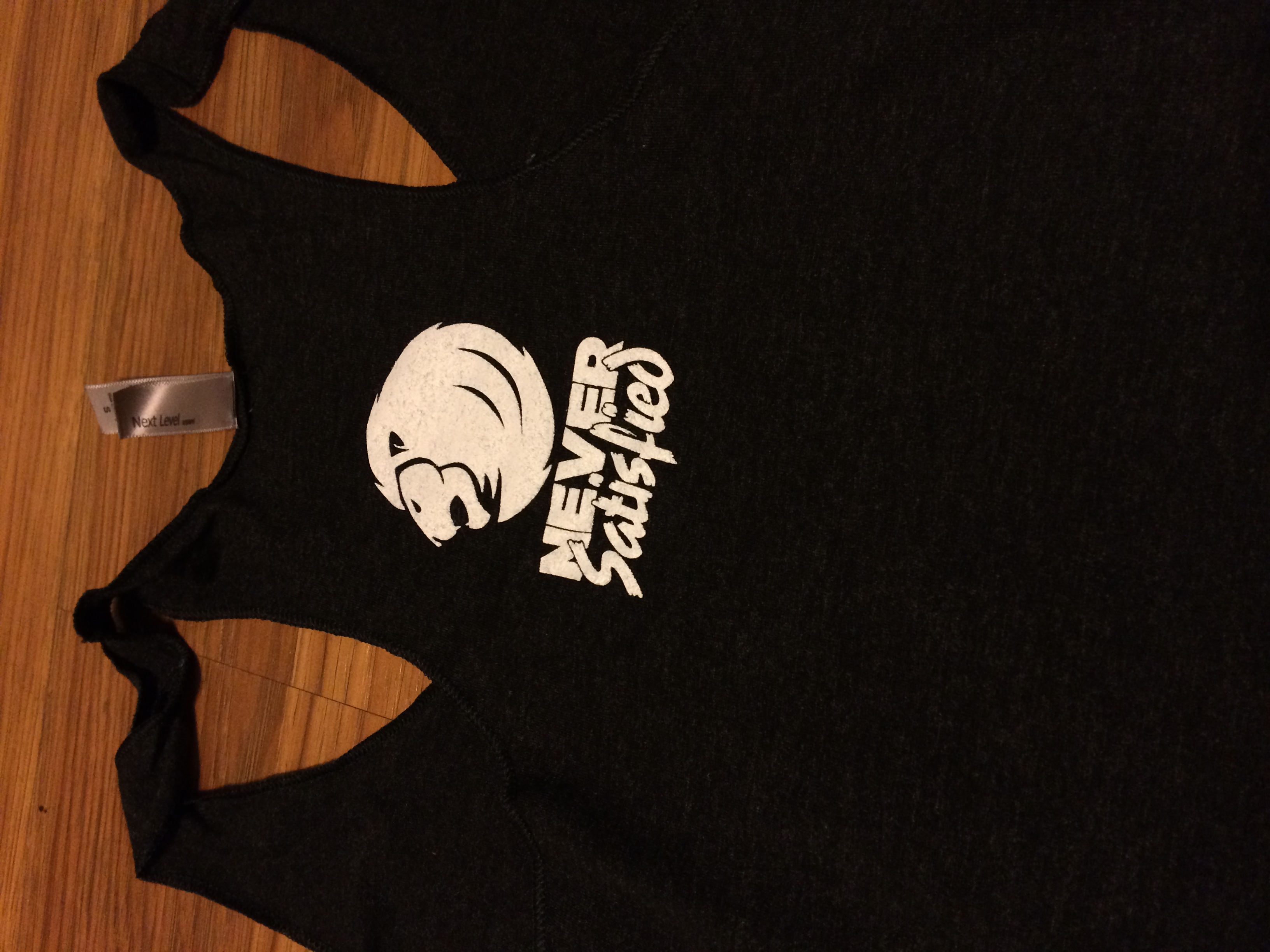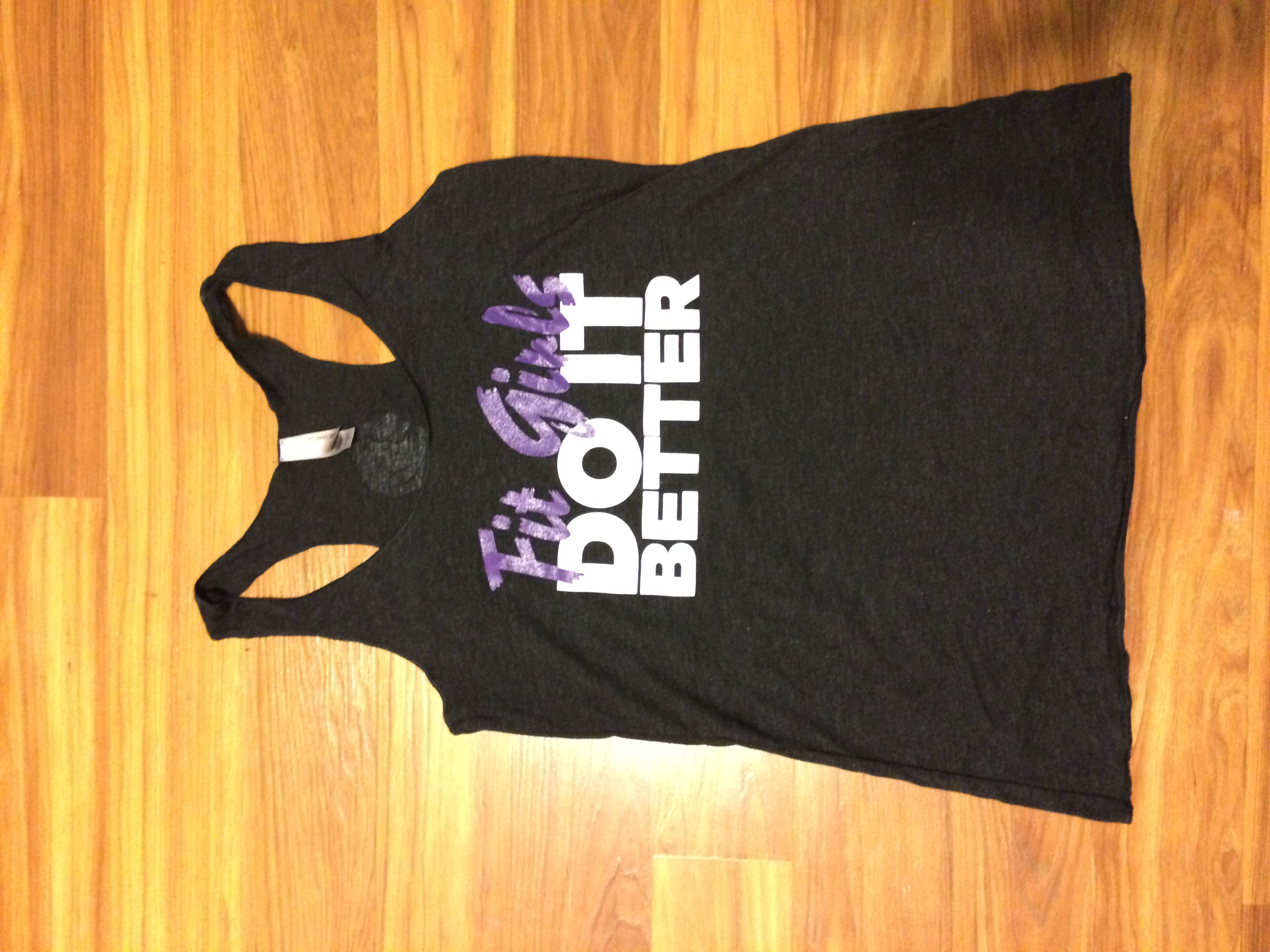This item is printed on a black racer-back tank with purple and white ink. We have "Fit Girls Do it Better" on the front and Never Satisfied and Lion head logo on the back.