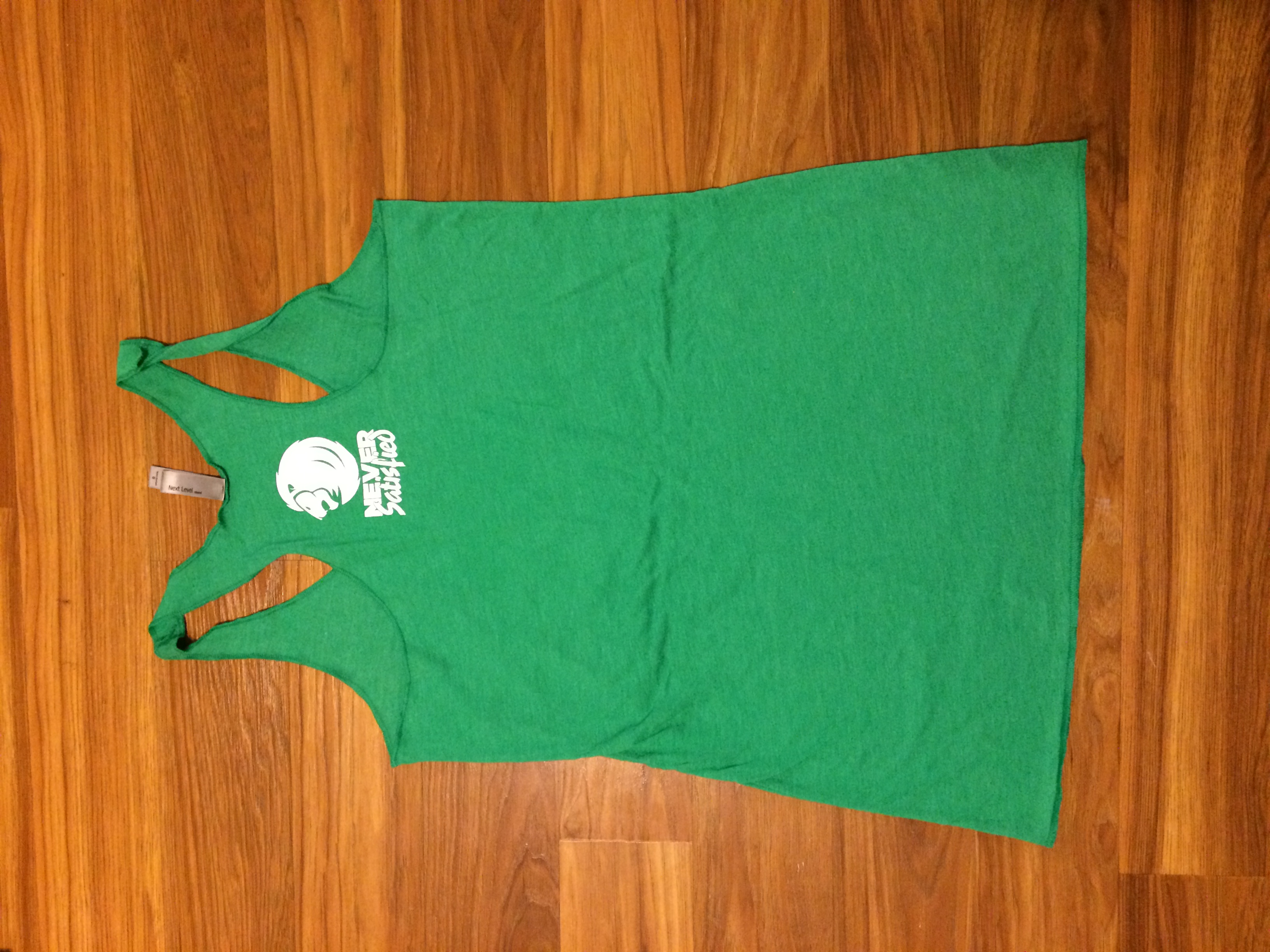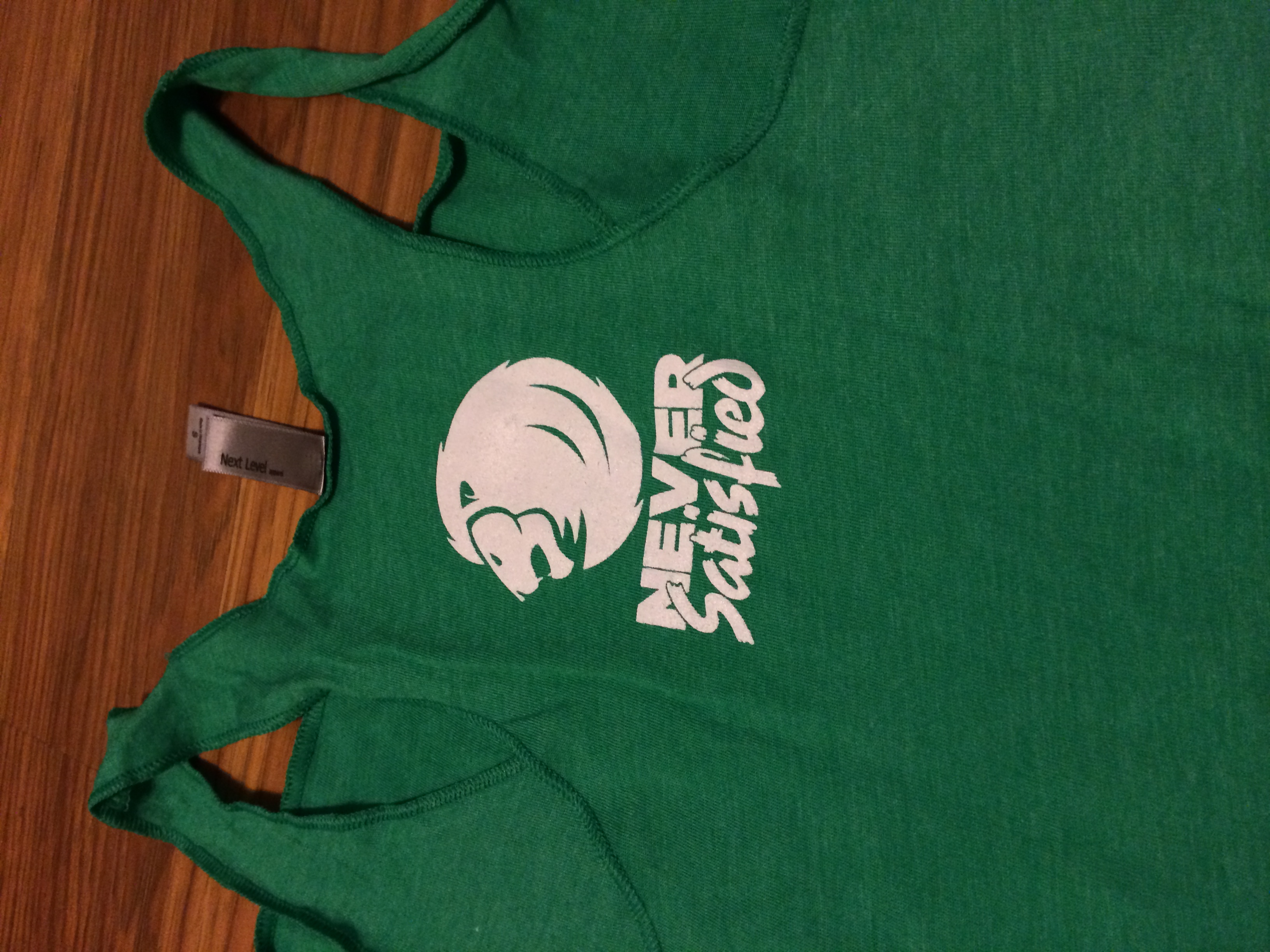 This item is printed on a green racer-back tank with black and white ink. We have "Fit Girls Do it Better" on the front and Never Satisfied and Lion head logo on the back.