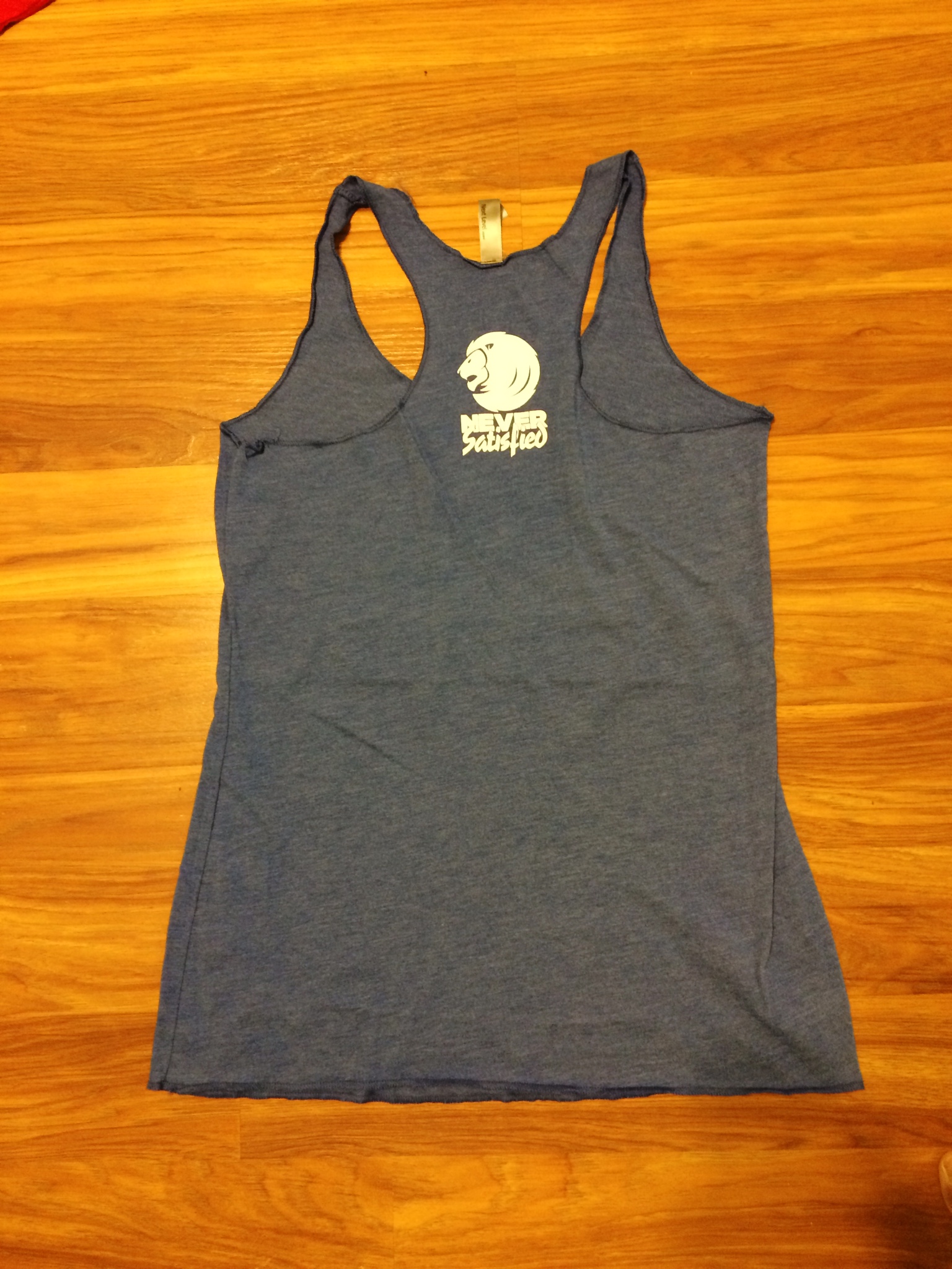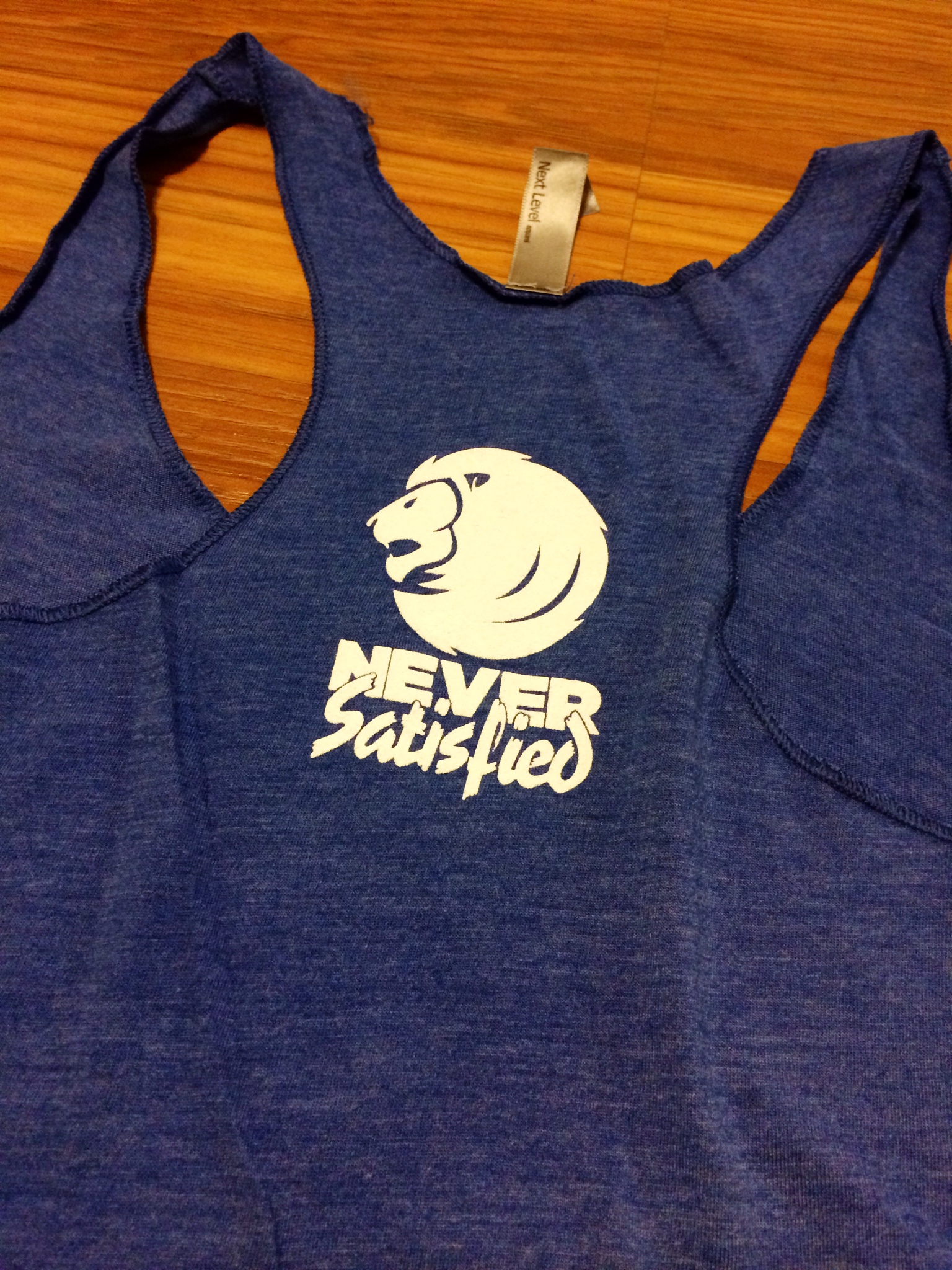 This item is printed on a blue racer-back tank with black and white ink. We have "Fit Girls Do it Better" on the front and Never Satisfied and Lion head logo on the back.